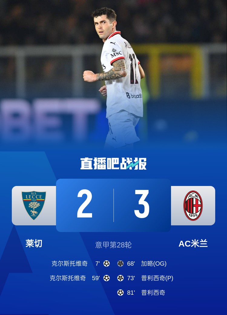意甲第28轮,AC米兰3-2逆转莱切。上半场,圣地亚哥-希门尼斯和加比亚进球被吹,克尔斯托维奇世界波;下半场,克尔斯托维奇再下一城,菲利克斯造成加略乌龙球,普利西奇造点+点射,随后又接到莱奥助攻打进制胜球。