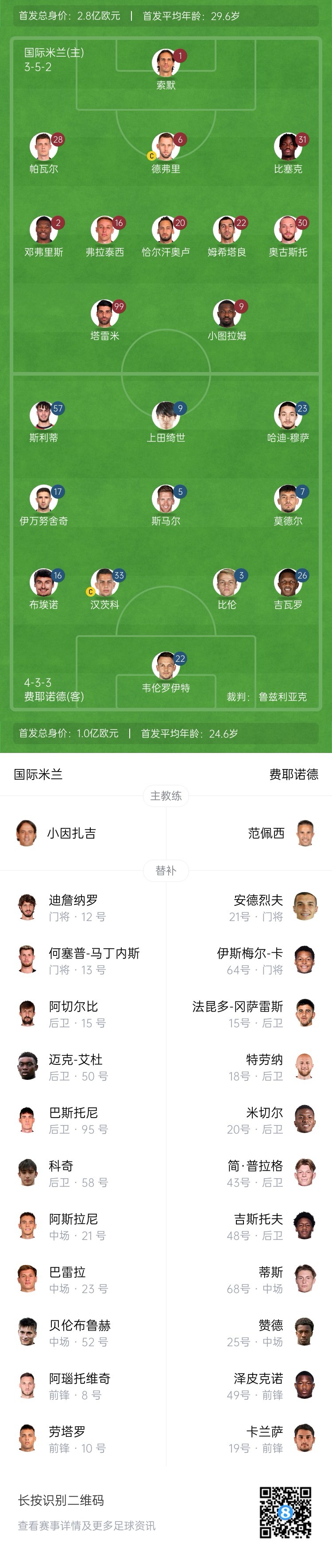 国米首发:1-索默、28-帕瓦尔、15-阿切尔比、31-比塞克、2-邓弗里斯、16-弗拉泰西、20-恰尔汗奥卢、22-姆希塔良、30-奥古斯托、99-塔雷米、9-图拉姆
