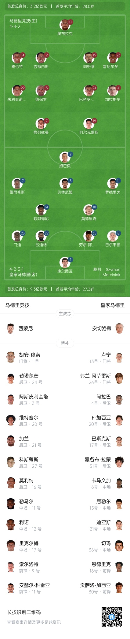 马竞vs皇马首发:小蜘蛛pk姆巴佩,维尼修斯、莫德里奇出战