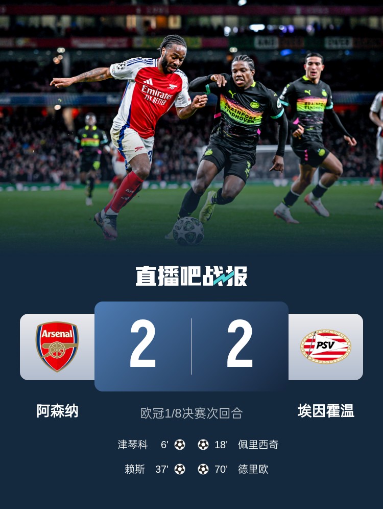 欧冠1/8决赛次回合,阿森纳2-2战平埃因霍温,总比分9-3晋级八强。上半场,津琴科破门,佩里西奇扳平,赖斯头球建功,斯特林送出2次助攻&错失1次单刀球机会;下半场,德里欧挑射破门。