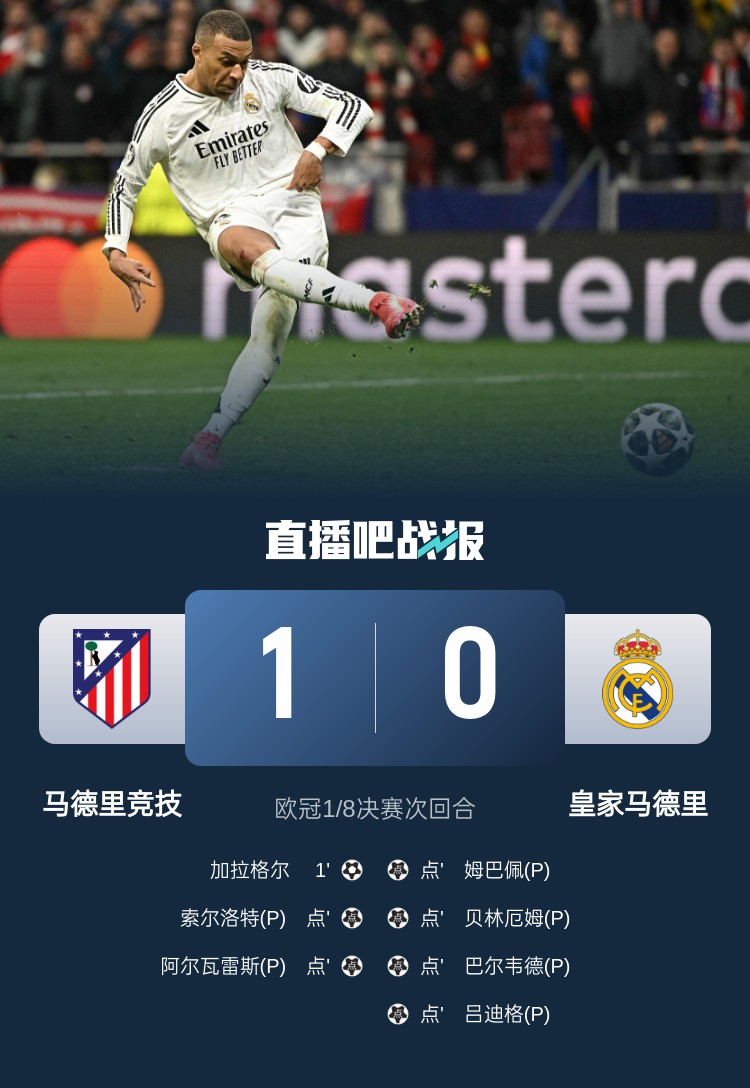 欧冠1/8决赛次回合,皇马两回合2-2,点球大战4-2击败马竞晋级欧冠8强,将迎战阿森纳。上半场,加拉格尔闪击破门,阿尔瓦雷斯两次劲射被库尔图瓦扑出;下半场,姆巴佩造点,维尼修斯主罚打飞;加时赛,双方均未制造破门良机;点球大战,阿尔瓦雷斯滑倒二次触球进球无效,巴斯克斯主罚被扑,略伦特击中横梁。