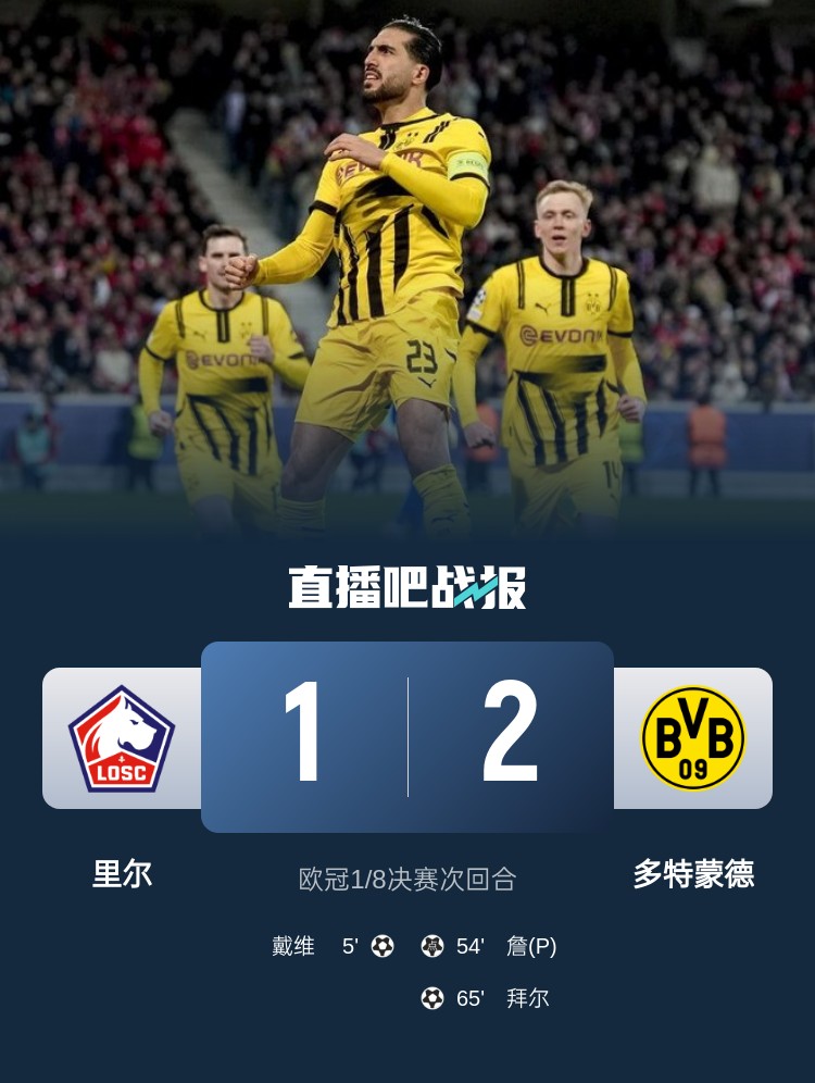 欧冠1/8决赛次回合,多特客场2-1里尔,总比分3-2淘汰对手。上半场,科贝尔黄油手送礼,戴维破门,格罗斯单刀被挡,切瓦利尔三连扑;下半场,吉拉西造点,埃姆雷-詹点球扳平,拜尔爆射反超。