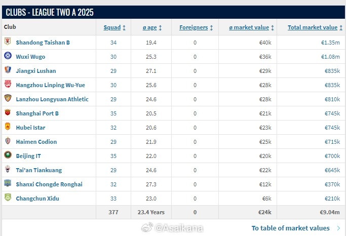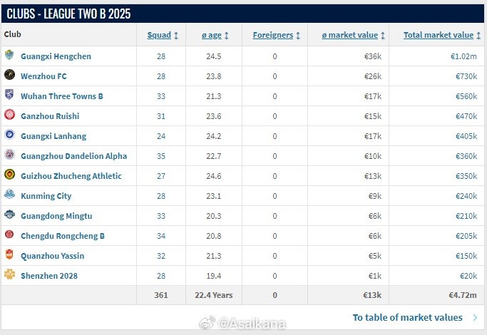 2025赛季中乙各队名单已在转会市场网更新。球队总身价方面,山东泰山B队以135万欧元列第一,后面依次是无锡吴钩(108万欧)、广西恒宸(102万欧)、江西庐山(83.5万欧)、杭州临平吴越(83.5万欧)、兰州陇原竞技(81万欧)、上海海港B队(74.5万欧)、湖北青年星(74.5万欧)、温州(73万欧)、南通海门珂缔缘(71.5万欧)、北京理工(70万欧)、泰安天贶(64.5万欧)、武汉三镇B队(56万欧)、赣州瑞狮(47万欧)、广西蓝航(40.5万欧)、山西崇德荣海(37万欧)、广州蒲公英(36万欧)、贵州筑城竞技(35万欧)、昆明城市(24万欧)、广东铭途(21万欧)、长春喜都(21万欧)、成都蓉城B队(20.5万欧)、泉州亚新(15万欧)、深圳二零二八(2万欧)。