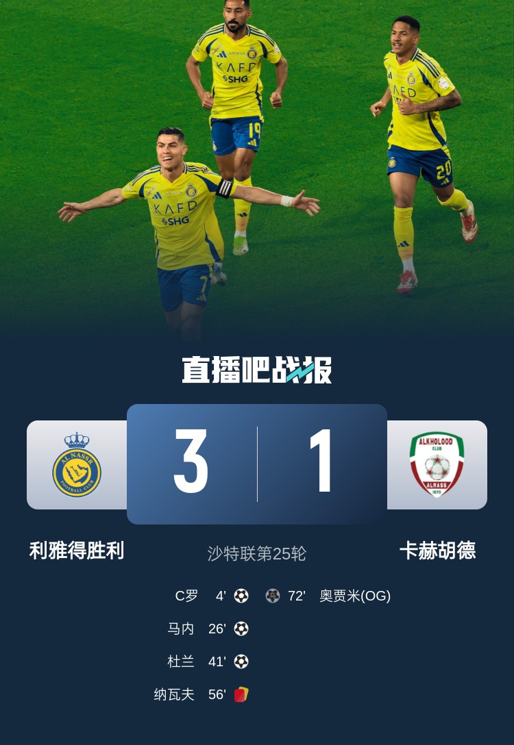 C罗破门+直塞策动,马内和杜兰建功,十人利雅得胜利主场3-1战胜卡赫胡德。