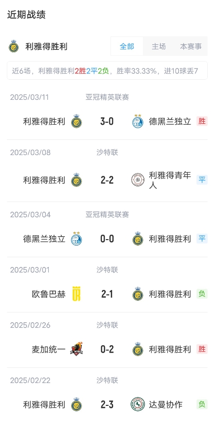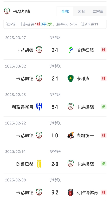 目前利雅得胜利取得了14胜6平4负的成绩,积48分,暂居联赛第4。卡赫胡德取得了9胜4平11负成绩,积31分,暂居联赛第10。