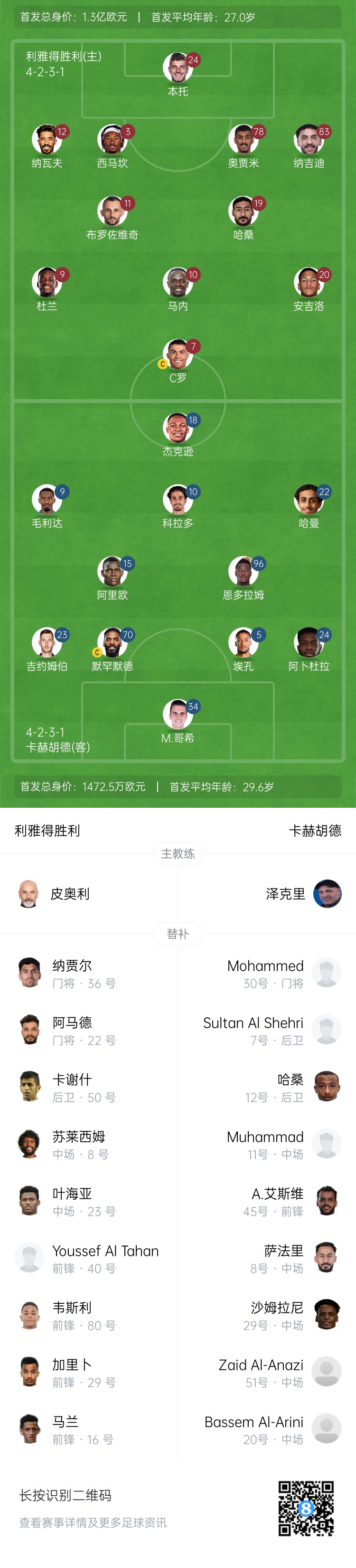 利雅得胜利首发:24-本托、12-纳瓦夫、3-西马坎、78-奥贾米、83-纳吉迪、19-哈桑、11-布罗佐维奇、20-安吉洛、10-马内、9-杜兰、7-C罗