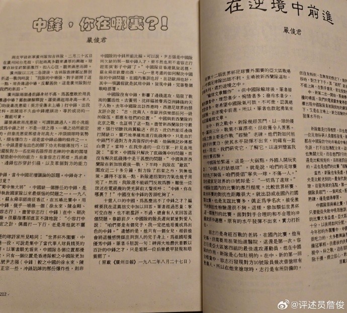 父亲说,这些小薄纸片挺“解渴”的。那里肯定也有严俊君老总的“耕耘之作”。我开始工作后,和“足球报”很多同行成为好友,可惜那时严总已经退居二线,无缘相见。今晚得知他老人家驾鹤西去,心中惆怅。谢谢您!曾经带我们这些球迷去“看世界”……