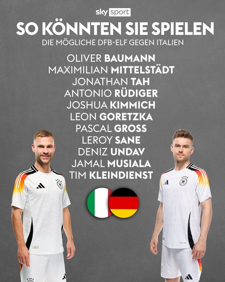 德天空预测德国队首发如下:鲍曼、米特尔施塔特、若纳坦-塔、吕迪格、基米希、格雷茨卡、格罗斯、萨内、翁达夫、穆西亚拉、克莱因丁斯特