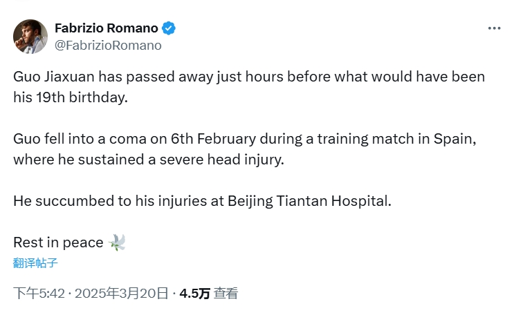 03月20日讯 18岁的国安青训小将郭嘉璇昨日去世, 罗马诺在社媒发文表示哀悼。