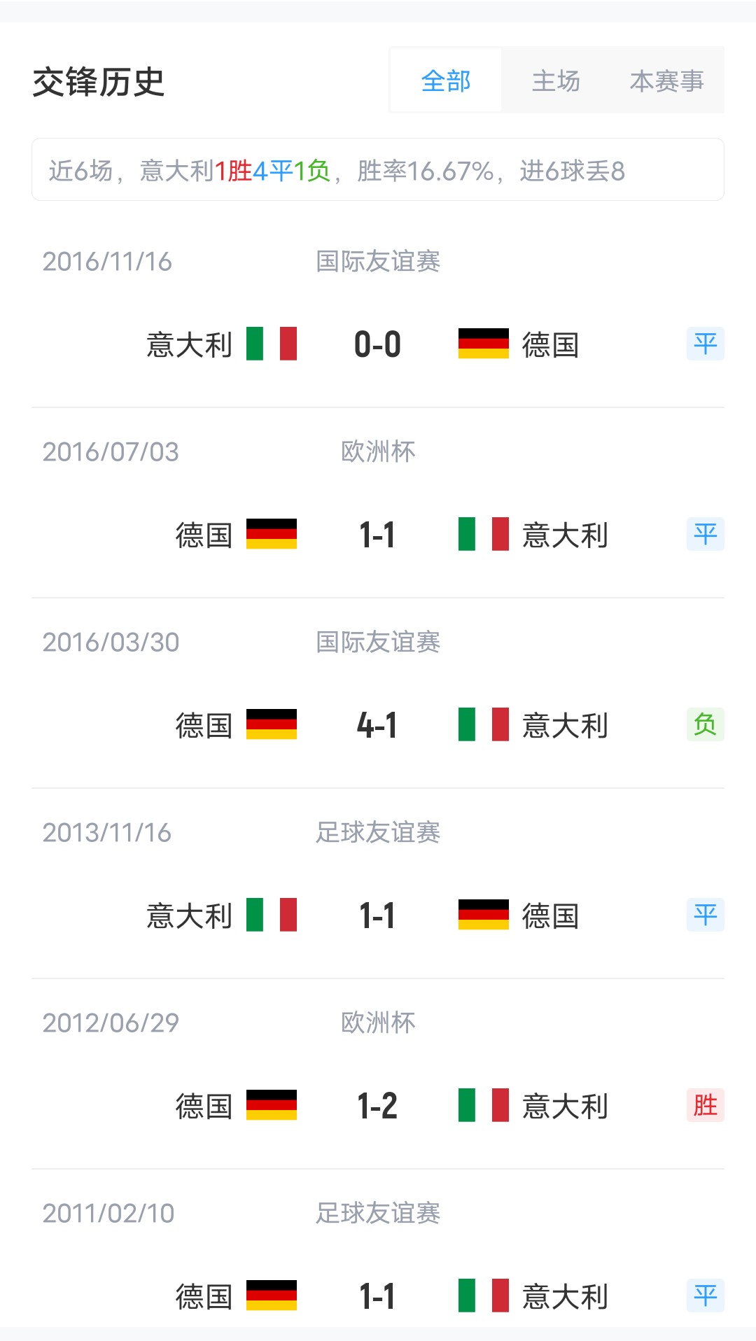 在欧国联小组赛中,意大利排名B组第2,德国排名C组第1;双方近6场直接对话中,意大利取得了1胜4平1负的战绩。两队最近一次交手,是在2016年11月16日,友谊赛意大利0-0战平德国。