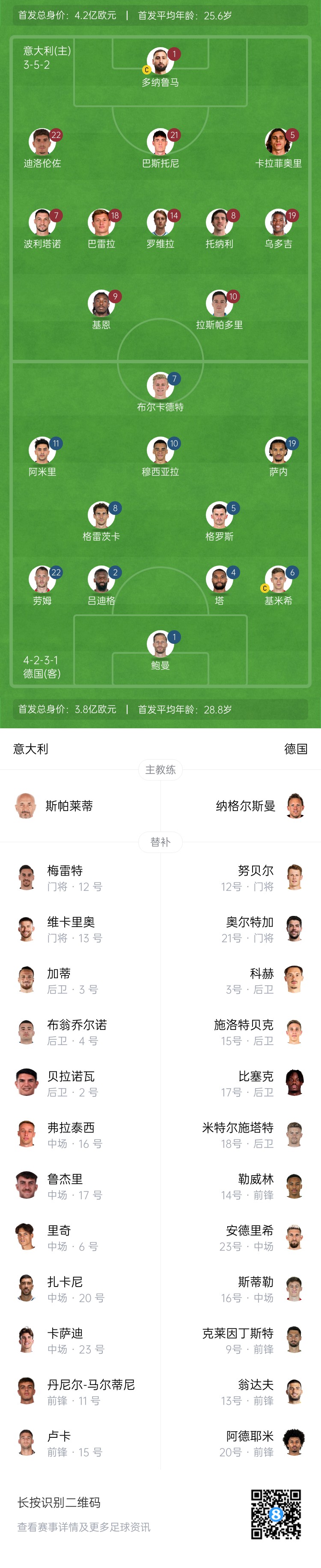 3月21日讯 北京时间今天3点45分,欧国联1/4赛决赛首回合,意大利主场迎战德国。赛前双方公布首发阵容。
