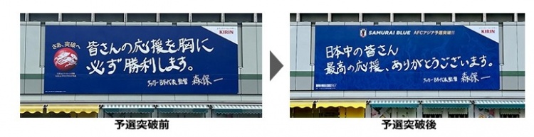 而在击败巴林队获得世界杯入场券后,看板内容改成:“日本的各位,感谢你们最棒的声援。”