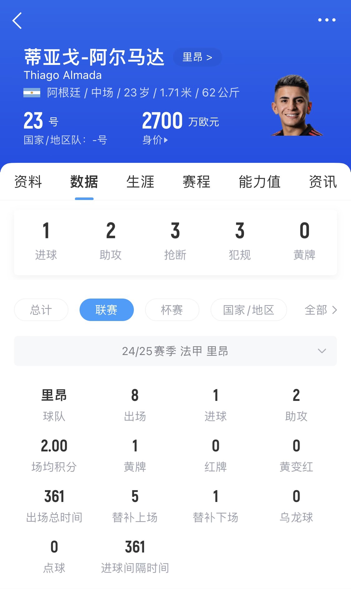 23岁的阿尔马达今年租借里昂,3月16日刚收获法甲首球,近两场法甲1球2助,球员目前身价为2700万欧。