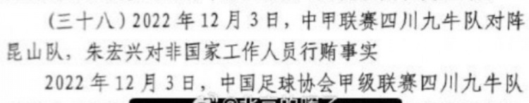 2022年12月3日,中甲联赛四川九牛队对阵昆山队,朱宏兴对非国家工作人员行贿事实。