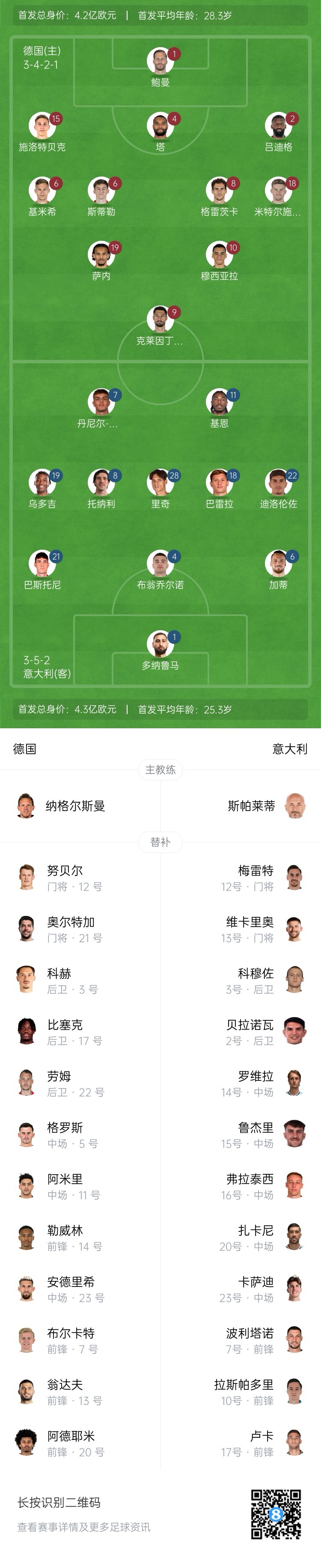 3月24日讯 欧国联1/4决赛次回合,德国vs意大利首发出炉。阵容更新中。首回合对阵,德国2-1意大利。