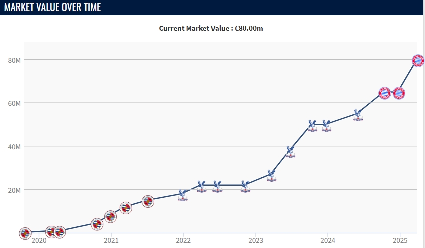 2024年夏窗,拜仁花费5300万欧元从水晶宫签下奥利塞,合同签至2029年6月。本赛季奥利塞代表拜仁出战41场比赛,贡献13粒进球和13次助攻。