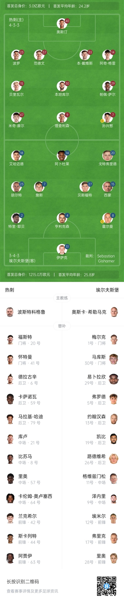 热刺首发:40-奥斯汀、23-佩德罗-波罗、14-阿奇-格雷、37-范德文、33-本-戴维斯、29-萨尔、30-本坦库尔、15-贝里瓦尔、47-米奇-摩尔、9-理查利森、7-孙兴慜
