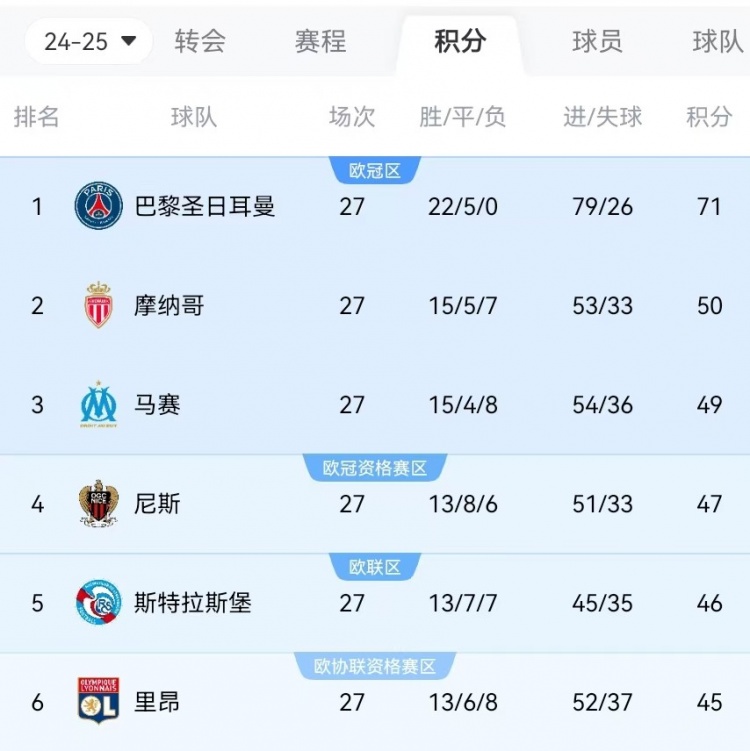 3月30日讯 巴黎在本轮法甲6-1血洗圣埃蒂安,在还剩7轮情况下领先第二名摩纳哥多达21分+33净胜球。