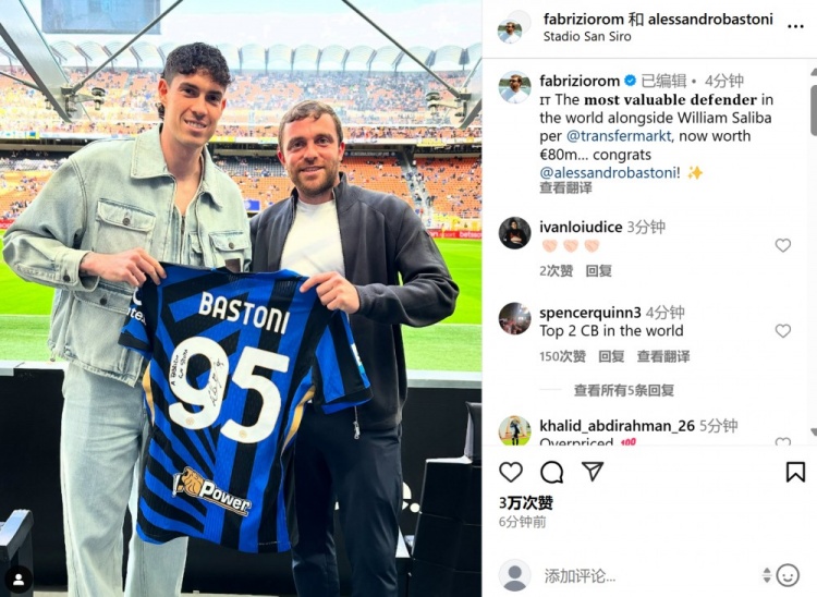 罗马诺社媒晒与巴斯托尼合影:8000万欧,世界身价并列最高后卫