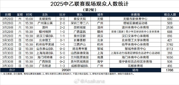 3月31日讯 据德转中国区管理员朱艺统计,中乙第2轮场均现场观众1708人,四场比赛观众超千人,其中泰山B队主场8113人最多。