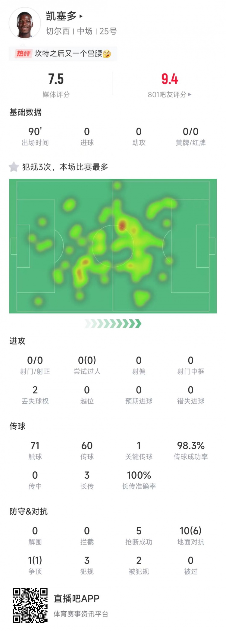 凯塞多当选本场比赛最佳球员,切尔西官方社媒晒出他领奖的照片,配文:“这个人的表现太棒了。”