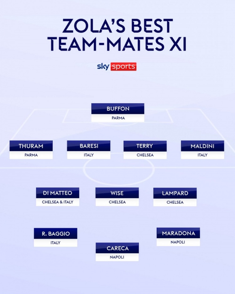 佐拉选生涯队友最佳阵:马拉多纳、马尔蒂尼、布冯、特里在列