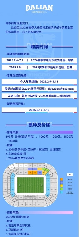 2月6日讯 大连英博俱乐部发布2025赛季票务公告,开启新赛季票务出售。