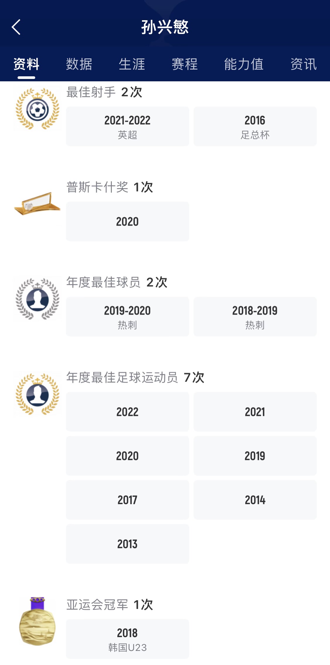 孙兴慜2010年代表汉堡首次出战职业联赛,2013加盟勒沃库森,2015年加盟热刺,俱乐部层面尚未赢得任何冠军荣誉。
