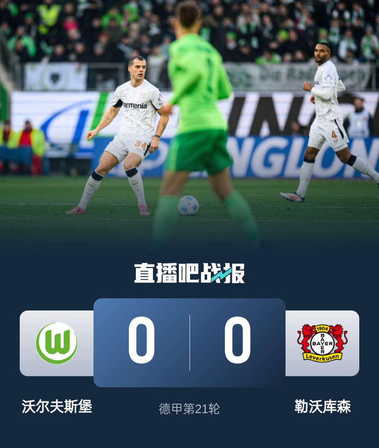 勒沃库森本轮0-0战平沃尔夫斯堡,目前球队落后榜首8分。