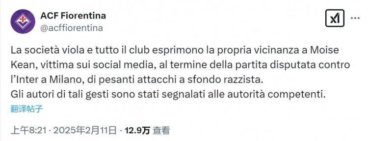 佛罗伦萨声明:小基恩遭到严重种族主义攻击,已报告相关当局