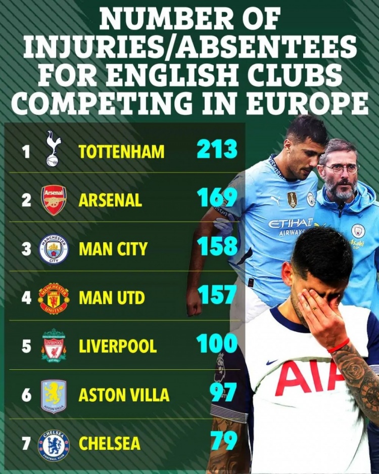 据统计,热刺伤病比本赛季参加欧战的任何英超球队都要严重25%。在39场比赛中,热刺总缺席人次达到213人次,比排名第二的阿森纳多出44人。
