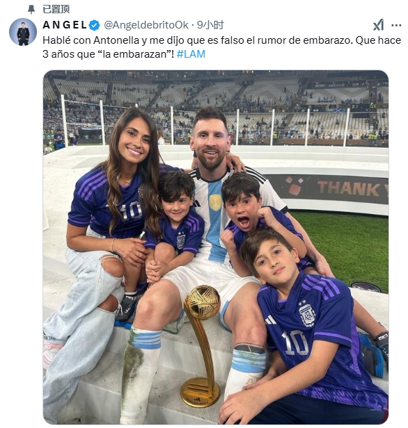 阿根廷媒体LAM记者Angel debrito在社媒辟谣写道:我与安东内拉进行了交谈,她告诉我怀孕传闻是假的,他们已经说了她怀孕的事3年了。