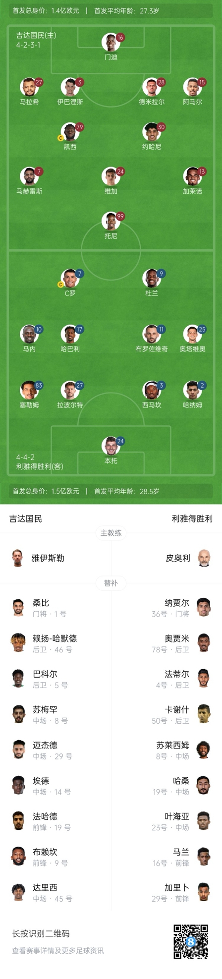 吉达国民首发:16-爱德华-门迪、27-马加希斯、3-伊巴涅斯、28-德米拉尔、15-阿马尔、79-凯西、30-约哈尼、7-马赫雷斯、24-加布里-维加、13-加莱诺、99-伊万-托尼