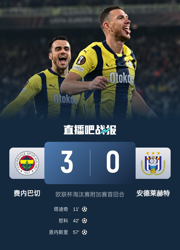 塔迪奇、哲科、恩内斯里,费内巴切3-0完胜安德莱赫特。