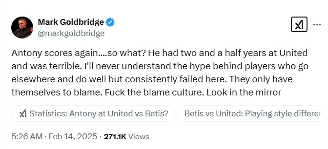 英国著名曼联球迷频道The United Stand的主理人Mark Goldbridge对此表示道:“安东尼又进球了...那又怎么样?他在曼联待了2年半时间,表现很糟糕。我永远无法理解那些去其他地方表现很好的球员背后的炒作,不过他们总是在这里失败。他们只能怪自己,去他*的责备文化,照照镜子吧。”